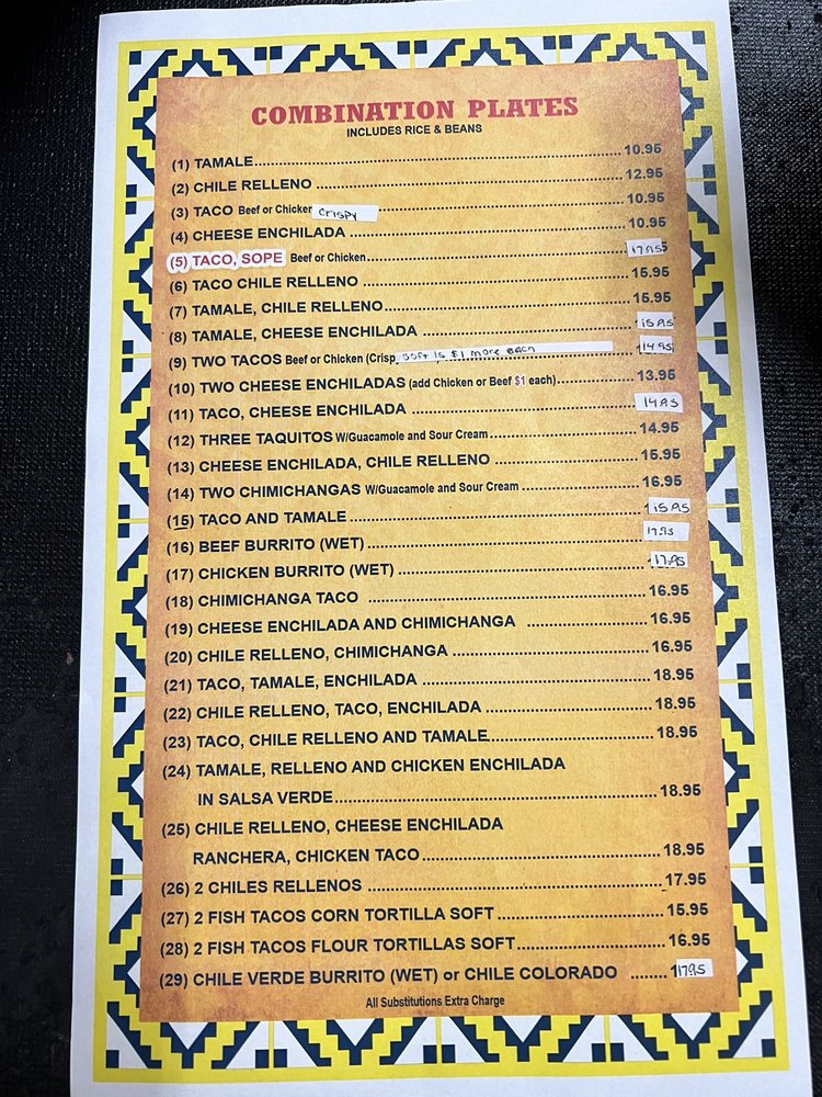 One Chile relleno, cheese enchilada, and your choice of a beef or chicken crispy taco. Served with rice and refried beans